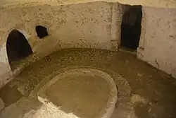 Doch war unterirdisch in einer Grabkammer bzw. Katakombe wenig Platz, sodass das Totenmahl wohl meist im Freien oder in einem Triclinium nahe beim Grab abgehalten wurde. Unter der Basilika von San Sebastiano in Rom wurde 1915 eine 360 Quadratmeter große Hofanlage (sogenannte Triklia) für Totenmahlsfeiern ausgegraben. Da war alles vorhanden: ein Brunnenhaus lieferte das nötige Wasser, umlaufende überdachte Bänke ermöglichten es, im Schatten zu speisen.[6][5] Das entspricht genau der Anlage der sogenannten Flavier-Galerie, einer ursprünglich paganen Hofanlage für den Totenkult.[7]