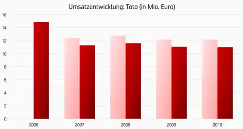Der Umsatz von 2006 belief sich ohne Torwette auf 14,87 Millionen Euro, ein Jahr später konnte man nur noch 11,34 Millionen Euro verbuchen. Berechnet man allerdings den Umsatz der Torwette ein, so wuchs der Umsatz im Jahr 2007 auf 12,41 Millionen Euro. Im Jahre 2008 erzielten die Österreichischen Lotterien mit Toto und Torwette einen Umsatz von 12,74 Millionen Euro; exkl. Torwette ergibt das einen Betrag von 11,66 Millionen. Im Folgejahr (2009) reduzierten sich die Einnahmen auf 12,19 Millionen, zieht man davon den Umsatz der Torwette ab, betrug der Umsatz sogar nur 11,08 Millionen Euro. 2010 konnten die Österreichischen Lotterien ihren Umsatz mit ebenfalls 12,19 Millionen Euro halten; etwas weniger als 11 Millionen Euro hoch war der Umsatz von Toto ohne Torwette.[10]