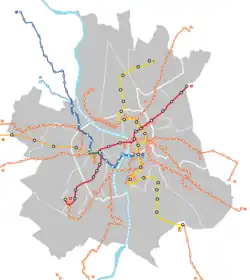 Seit 1993 gibt es eine U-Bahn (Métro Toulouse), die mit der Linie A zunächst einen verbesserten Transport zwischen Osten und Westen der Stadt gewährleistete. Die Linie B, die in Nord-Süd-Richtung verläuft, wurde im Sommer 2007 eingeweiht. Im Dezember 2010 kam eine elf Kilometer lange Straßenbahnlinie vom Verkehrsknotenpunkt Arènes in Richtung Nordwesten, unter anderem nach Blagnac, hinzu, die im Dezember 2013 über die Pont Saint-Michel hinweg bis an den Rand der Innenstadt verlängert wurde.[14] Eine Zweigstrecke zum Flughafen wurde 2015 eingeweiht.[15] Darüber hinaus wird der Personennahverkehr durch Busse unterstützt. Als wichtiges Verkehrsmittel hat sich auch der Fahrrad-Leihservice „VélôToulouse“ etabliert. An 253 Stationen in der Stadt können rund um die Uhr Fahrräder entliehen werden.[16]