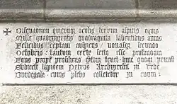 Auf dem Stein finden wir den Text in mittelalterlicher Form: Einige Wörter sind abgekürzt, für ae oder oe steht e (equis, ceptam, Archipresul, colletetur, evum). Seltsam und sonst nicht belegt ist das erste Wort disquadram „un-viereckig“. Damit ist offenbar ein Mangel genannt, der unregelmäßige Grundriss des Turms. Könnte man bisquadram lesen, hiesse das „zweimal viereckig“, also „achteckig“. Das D ist aber deutlich lesbar und der Turm keineswegs achteckig. Der Mangel, den man oculis aequis, mit gerechten Augen betrachten und übergehen sollte, ist durch die besondere Höhe des Bauwerks gerechtfertigt. Die Inschrift lautet also: