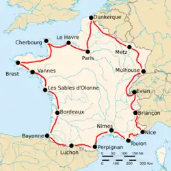 Die Strecke verlief wie in den Vorjahren gegen den Uhrzeigersinn und hatte einen ähnlichen Kurs. Mülhausen und Évian-les-Bains waren zum ersten Mal Etappenorte. Insgesamt hatten die Fahrer auf den 18 Etappen 5430 km zurückzulegen. Damit wurde die Anzahl der Etappen der Tour erhöht, die Länge der Etappe jedoch verringert, sodass die Gesamtlänge etwa gleich blieb. 130 Fahrer nahmen an dieser Rundfahrt teil, immerhin 49 wurden auch gewertet.