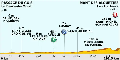 | Mont des Alouettes (Les Herbiers) Kategorie 4 nach 191,5 km auf 228 m 2,2 km bei 4,7 % | |||