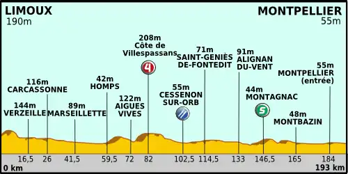 | Côte de Villespassans Kategorie 4 nach 82 km auf 208 m 2,2 km bei 4,6 % | |||