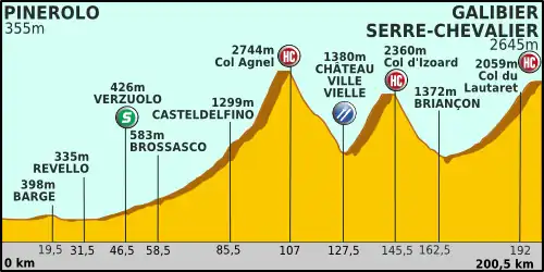 Zu Beginn der Etappe schlugen die Teams Europcar und HTC-Highroad ein hohes Tempo an, was alle Ausreißversuche zunächst zunichtemachte. Sowohl eine 20-köpfige Gruppe als auch Gianni Meersman und Marco Marcato wurden nach kurzer Führung wieder eingeholt. Kurz vor dem Zwischensprint setzte sich eine siebenköpfige Gruppe ab, aus der heraus Leonardo Duque die Sprintwertung gewann. Danach entstand eine 16-köpfige Spitzengruppe, in der sich unter anderem Maxime Monfort, Joost Posthuma, Rubén Pérez, Maarten Tjallingii, Maxim Iglinski, Imanol Erviti, Nicolas Roche, Dries Devenyns, Leonardo Duque, Danilo Hondo und Johnny Hoogerland befanden. Mit 50,3 km/h war die Durchschnittsgeschwindigkeit der ersten Stunde erneut sehr hoch. Während die Ausreißer ihren Abstand vergrößerten, kam eine Verfolgergruppe aus Mickaël Delage, Marcus Burghardt und Jegor Silin an sie heran und erreichte sie schließlich am Fuße des Col Agnel. Etwa zu dieser Zeit erreichten sie ihren größten Vorsprung von über neun Minuten vor dem Feld. Delage kam zu Fall, konnte aber wieder zur Spitzengruppe aufschließen. Im Anstieg verkleinerte sich der Vorsprung der Gruppe wieder, in der verschiedene Fahrer die Führung übernahmen und eine siebenköpfige Verfolgergruppe, bestehend aus Christophe Riblon, Levi Leipheimer, Carlos Barredo, Kristijan Koren, Andrei Seiz, Rémy Di Gregorio und Philippe Gilbert, entstand. Im weiteren Verlauf des Anstiegs fielen sieben Fahrer aus der Spitzengruppe heraus, die dann nur noch aus zwölf Fahrern bestand. Aus der Verfolgergruppe blieben nur noch Leipheimer und Riblon vorn, die Gesellschaft von Lieuwe Westra bekamen. Auch Robert Gesink und David Moncoutié zeigten sich vor dem Feld. Später bildete sich eine Verfolgergruppe aus Gesink, Seiz, Leipheimer, David Arroyo, Arnold Jeannesson, Moncoutié und Westra. Die Bergwertung gewann schließlich Iglinski, der kurz vor der Bergwertung angriff, dann aber wartete.