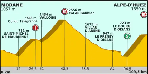 Die 19. Etappe der Tour de France 2011 am 22. Juli führte über 109,5 Kilometer von Modane Valfréjus nach L’Alpe d’Huez. Auf dieser Hochgebirgsetappe gab es eine Sprintwertung und drei Bergwertungen, darunter zwei der Hors Catégorie und eine der 1. Kategorie. Über den Col du Télégraphe (1566 m) wurde erneut der Col du Galibier angefahren, jedoch wurde das Rennen diesmal durch den auf 2556 m Höhe gelegenen im Jahr 2002 wiedereröffneten Tunnel geführt und nicht die eigentliche Passhöhe benutzt. Diese kurze Etappe endete in L’Alpe d’Huez auf 1850 m Höhe. Dies war die vierte und letzte Bergankunft dieser Tour de France. Es gingen noch 168 der 198 gemeldeten Fahrer an den Start.