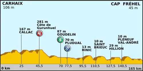 | Côte de Gurunhuel Kategorie 4 nach 45,5 km auf 281 m 2,3 km bei 5,1 % | |||