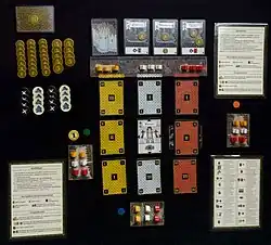 Hauptbestandteil des Spiels sind 123 Karten, mit denen das Spiel gesteuert wird. Den größten Anteil bilden 90 Aktionskarten in drei Farben und drei Wertigkeitsstufen, die für das Grundspiel benötigt werden. Jeder einzelne Satz, die den Adel (rot), Klerus (weiß) und das Bürgertum (gelb) repräsentieren, besteht aus 30 Karten, unterteilt in drei Wertigkeitsstufen (I, II und III) zu jeweils 10 Karten.[1] Daneben existieren noch 18 Erweiterungs- und 15 Ereigniskarten. Zum Spiel gehört ein doppelseitiger Spielplan in Form eines Minibretts mit einer Vorrats- und einer Wertungsseite. Weitere Spielelemente sind 4 Wertungssteine in den Farben der Spieler (beige, blau, rot und gelb) sowie 33 Einwohnerfiguren, unterteilt in 11 Bürger (gelb), 11 Kleriker (weiß) und 11 Adelige (rot).[2] Gespielt wird mit Münzen, die dem Gegenwert von einem, fünf und zehn Denaren entsprechen. Die letzten Spielelemente bestehen aus 4 Platzkarten, einem einzelnen Startspielmarker sowie 20 runden Schadensmarkern und grauen Einwohnern auf der Rückseite. Um den maximal 4 Spielern das Spiel zu erleichtern, gibt es noch 4 doppelseitige Spielhilfen mit genauen Erklärungen.