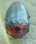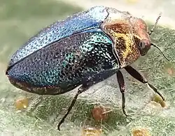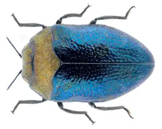 Der nur 2,2 bis 3,8 Millimeter lange Käfer ist breit oval. Er ist über der Flügeldeckenbasis deutlich längs und quer gewölbt, über der Fläche der Flügeldecken jedoch abgeflacht. Er ist deutlich zweifarbig. Kopf und Halsschild sind gelbkupfrig (Abb. 1 links) oder rotkupfrig (Abb. 1 Mitte) und stark glänzend, die Flügeldecken bläulich oder grünlich. Die Unterseite ist dunkel erzfarben (Abb. 1 rechts). Schwarze Exemplare tragen auf der Stirn oder der Körperseite einen feurigen oder purpurnen Glanz. Die Käfer können sehr kurz und zerstreut behaart sein.