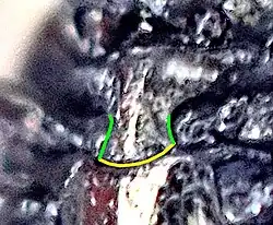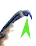 Abb. 4: Aufsicht, rechts Vergrößerung der Hinterkralle mit Pfeil auf Zahn