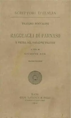 - Hubert Jedin, Religion und Staatsräson. Ein Dialog Trajano Boccalinis über die deutsche Glaubensspaltung. In: Ders., Kirche des Glaubens. Kirche der Geschichte. Ausgewählte Aufsätze und Vorträge, Bd. 1: Kirchengeschichtsschreibung. Italien und das Papsttum. Deutschland, Abendland und Weltkirche, Herder, Freiburg/Basel/Wien 1966, S. 271–285.