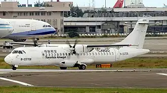 Das betroffene Flugzeug war eine ATR 72-202, ein Typ des von Aeritalia und Aérospatiale gegründeten, italienisch-französischen Konsortiums Avions de Transport Régional (ATR) zum Bau von Regionalflugzeugen. Die Maschine war zum Zeitpunkt des Unfalls 10 Jahre und 3 Monate alt. Sie trug die Werknummer 322, war am Produktionsstandort von ATR in Toulouse endmontiert worden und absolvierte am 29. August 1992 ihren Erstflug. Die Maschine wurde am 28. September desselben Jahres an die TransAsia Airways ausgeliefert. Die Maschine erhielt das Luftfahrzeugkennzeichen B-22708. Ab dem 12. Oktober 1998 war die Maschine an die britische Fluggesellschaft Gill Airways verleast, wo sie vorübergehend das Kennzeichen G-BXYV erhielt. Ab dem 1. Februar 2002 war die Maschine wieder bei der TransAsia Airways in Betrieb, wo sie nun als Frachtflugzeug eingesetzt wurde. Die Maschine war zu diesem Zeitpunkt, anders als die Passagierflugzeuge der Airline, komplett weiß lackiert und trug lediglich am Rumpf die Beschriftungen des Unternehmens sowie den Schriftzug CARGO. Das zweimotorige Regionalverkehrsflugzeug war mit 2 Turboproptriebwerken des Typs Pratt & Whitney Canada PW124B ausgestattet.