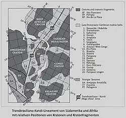 Das Transbrasiliano-Kandi-Lineament verläuft zwischen dem Amazonia-Kraton[2], den Kratonfragmenten Parnaíba[3], Paranapanema[4], Luiz Alves[5] und dem Westafrika-Kraton einerseits sowie dem São Francisco-Kraton[6], der Borborema-Provinz[7], dem Kongo-Kraton, dem Kalahari-Kraton[8], dem Rio de la Plata-Kraton[9] und dem Sahara-Metakraton[10] andererseits. Zwischen dem Westafrika-Kraton und dem Sahara-Metakraton befinden sich der Benin-Nigeria-Schild[11] und der nördlich liegende Tuareg-Schild[12].
