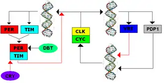 Der TTFL wurde erstmals in Drosophila entdeckt und das System weist mehrere Gemeinsamkeiten mit der TTFL von Säugetieren auf. Die Transkription der Clock-Gene period (per) und timeless (tim) wird initiiert, wenn die positiven Proteinelemente CYCLE (dCYC) und CLOCK (dCLK) ein Heterodimer bilden und E-Box-Promotoren binden, wodurch die Transkription initiiert wird. Während des Tages wird das Proteinprodukt TIM abgebaut; Belichtung erleichtert das Binden des Proteins CRY an TIM, wodurch TIM ubiquitiniert und schließlich abgebaut wird.[6] In der Nacht können TIM und PER Heterodimere bilden und sich langsam im Cytoplasma ansammeln, wo PER durch die Kinase DBT (double-time protein) phosphoryliert wird. Die posttranskriptionelle Modifikation mehrerer Phosphatgruppen dient zum Abbau des Komplexes und zur Erleichterung der Lokalisation des Komplexes im Zellkern. Im Zellkern bindet das PER-TIM-Dimer an das CYC-CLK-Dimer, wodurch das CYC-CLK-Dimer aus den E-Boxen freigesetzt und die Transkription inhibiert wird. Sobald sich PER und TIM zersetzen, können CYC-CLK-Dimere die E-Boxen erneut binden, um die Transkription zu initiieren und die negative Rückkopplungsschleife zu schließen.[7]
