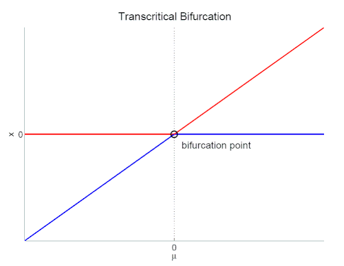 folgt ebenfalls einer transkritischen Bifurkation. Sie besitzt die Fixpunkte und . Der Ursprung ist hier stabil für und instabil für , während für stabil ist und diese Stabilität für verliert.[1]