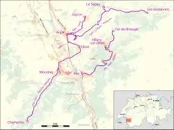 | Aigle–Ollon–Monthey AOM, 2.4.1907 | Monthey–Champéry–Morgins MCM, 1.2.1908 | Bex–Gryon–Villars–Chesières BGVC, 12.8.1906 | Villars–Bretaye VB, 18.12.1913 | ||||||||||||||||||||||||||||||