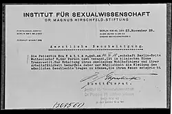 Das Institut fungierte als Gutachter für Transvestitenscheine und andere „Trans-Atteste“, was für das IfS auch eine willkommene wirtschaftliche Komponente in dieser von der Weltwirtschaftskrise gezeichneten Zeit darstellte. 1924 berechnete das Haus für ein solches Gerichtsgutachten 150 Reichsmark, und als Gebühr für einen Transvestitenschein wurde 1929 50 RM erhoben. Hilfreich für die Betroffenen war es auch, dass es 1921 einen Beschluss des preußischen Innenministeriums gab, wonach es möglich wurde, dass die begutachteten Männer und Frauen ihren Vornamen geschlechtstypisch angleichen oder geschlechtsneutrale Namen wie Alex, Toni oder Gert tragen durften. Allerdings wurden diese Änderungen in den amtlichen Verlautbarungen öffentlich gemacht, womit die Betroffenen unfreiwillig geoutet wurden. Die Verlautbarungen enthielten die Klarnamen, persönliche Daten und sogar die Wohnadressen der Betreffenden. Aber auch danach waren sie abhängig vom Verständnis der Polizei und Justiz, auf deren Genehmigung sie angewiesen und deren Kontrollwillkür sie ausgeliefert waren. Insofern hatten Transvestiten trotz dieser Liberalisierungen also auch weiterhin einen prekären Status.[7]