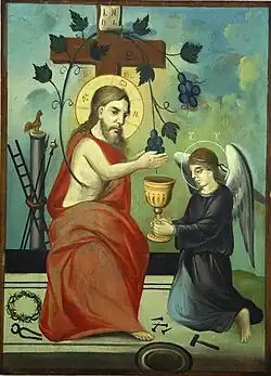 Vergleichbar damit sind Darstellungen des gekreuzigten Jesus als „der wahre Weinstock“ (Joh 15,1 ). Dabei fließt das Blut aus seiner Seitenwunde als Wein in den Abendmahlskelch.