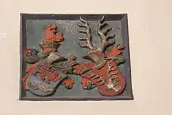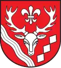Blasonierung: „In Rot ein hersehender, silberner Hirschkopf mit einer schwebenden, silbernen Lilie zwischen den Geweihstangen. Ein schräg rechts verlaufender, erniedrigter silberner, von zwei Wellenlinien geteilter Wellenbalken und in Silber drei erniedrigt, schräg links gestellt Rauten, die mit den spitzen Enden aneinanderstoßen.“ |