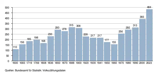 - ↑ Daten der Eidgenössischen Volkszählungen ab 1850 nach Gemeinden. (XLSX; 10 MB) Bundesamt für Statistik, Neuchâtel, 12. Juli 2024, abgerufen am 1. Januar 2025 (Öffnung in Excel nur über "Anhang/Excel-Datensatz" möglich).