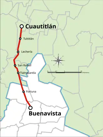 - vom alten Bahnhof Buenavista in Mexiko-Stadt bis zur Gemeinde Cuautitlán im Bundesstaat Mexiko;