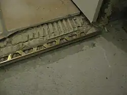 Charakteristisch ist die durchbrochene Feder, mit der die Trennschiene in den Kleber oder Mörtel unter dem Belag eingebettet und fixiert wird.