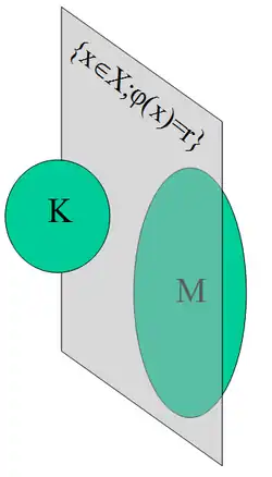 - Sei ein normierter Vektorraum (oder lokalkonvexer Raum) über oder . Seien weiter eine nicht-leere, abgeschlossene, konvexe Menge und eine nicht-leere, kompakte, konvexe Menge. Dann existiert ein lineares stetiges Funktional mit :::.