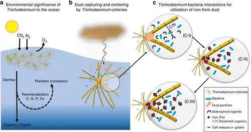 b – Trichodesmium kann in nährstoffarmen Ozeanregionen mit hoher Staubablagerung massive Blüten ausbilden, was zum Teil auf seiner speziellen Fähigkeit beruht, Staub einzufangen, zu konzentrieren und anschließend biologisch aufzulösen.[23]