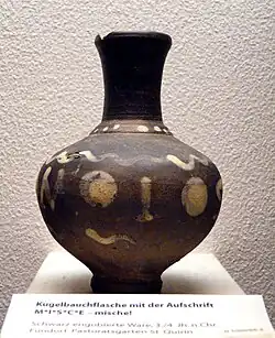 Die aufgemalten Inschriften geben Einblick in die Tischsitten des 3. und 4. Jahrhunderts n. Chr. Viele vorhandene Inschriften sind bis zu dessen Erscheinen zusammengefasst im Corpus Inscriptionum Latinarum Band XIII.[11] Meist geben sie alltägliche Dialoge zwischen dem Wirt und seinem Gast, Zecher und Freundin sowie dem Gefäß und dem Trinker wieder. Die weitaus größte Gruppe enthält Zurufe oder Aufforderungen zum Weintrinken. Die Schrift bestand üblicherweise aus Weißbarbotine-Punkten oder sie wurde aufgemalt. Durch ihr Dekor oder ihre Inschriften sind außerdem einige Gefäße als Votivgabe identifizierbar. Sie geben Aufschluss über das religiöse Gedankengut dieser Zeit. Besonders zahlreich sind dabei die Bezüge zum Mithraskult.