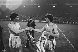 Als Durchbruch des Trikottauschs als übliches Ritual gilt die Weltmeisterschaft 1970, bei der der brasilianische Topstar Pelé seinem Gegner Bobby Moore sein Trikot schenkte, nachdem Brasilien mit 1:0 gewonnen hatte. Daraufhin übergab auch Moore Pelé sein Trikot. Dieses wurde im Jahr 2004 für 60.000 Euro versteigert.[1] Im Juni 1998 wurde ein Tausch der Trikots von der FIFA zeitweise verboten. Dies wurde mit einer möglichen Anstößigkeit begründet.[2]