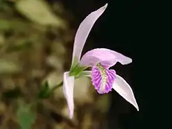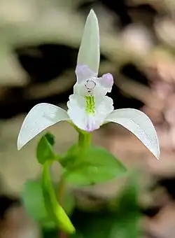 Die Exemplare einer Population blühen oft genau gleichzeitig. Die einzelne Blüte hält nur einen Tag, die Blüten eines Blütenstands blühen nacheinander auf.[4] Der Blütenstand enthält ein bis zehn Blüten, die – je nach Art – resupiniert sind oder nicht. Die Tragblätter gleichen den obersten Laubblättern. Der Fruchtknoten ist schmal spindelförmig.[3] Die Blütenblätter sind nicht miteinander verwachsen, sie sind weiß bis rosa gefärbt. Die Sepalen und seitlichen Petalen sind einander ähnlich, lanzettlich geformt.[4] Das dorsale Sepal ist konkav bis kapuzenförmig gebogen, die seitlichen Sepalen sind asymmetrisch und leicht sichelförmig gebogen. Die Lippe ist an der Basis keilförmig verschmälert, die Spreite ist dreilappig.[2] Auf der Spreite befinden sich drei längs verlaufende, gelb oder rosa gefärbte Leisten. Die Säule ist weiß oder hellgrün,[4] gerade und leicht keulenförmig.[4] Die Narbe ist einfach oder zweilappig. Das Staubblatt enthält zwei Pollinien, die von mehliger Konsistenz sind. Die Kapselfrucht ist oval bis umgekehrt-eiförmig, mit sechs längs verlaufenden Leisten.[4]