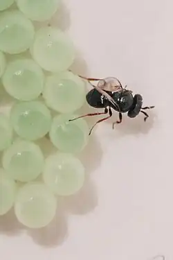 Trissolcus sp. bei der Eiablage in ein Baumwanzen-Eigelege.