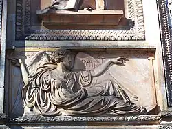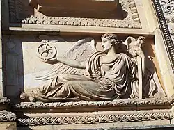 Die beiden Relieftafeln von Friedrich Wilhelm Dankberg auf der Vorderseite des Tores sind symmetrisch aufgebaut. Die Frauenfiguren sind in antiken Gewändern dargestellt. Beide Figuren tragen Flügel und Attribute, die ihre Bestimmung verraten.[3]