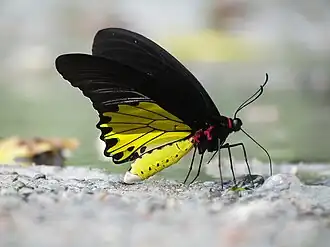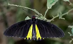 Die Flügelspannweite der Falter beträgt 150 bis 180 Millimeter.[2] Zwischen den Geschlechtern besteht ein leichter Sexualdimorphismus. Bei den Männchen ist die Vorderflügeloberseite schwarz, die Hinterflügeloberseite kräftig gelb und mit einer schwarzen Punktreihe am Saum versehen, Schwanzfortsätze fehlen. Weibchen unterscheiden sich durch die weißlich eingefassten Adern auf der Vorderflügeloberseite sowie die doppelte schwarze Punktreihe auf der Hinterflügeloberseite. Die Zeichnung der Unterseite gleicht bei beiden Geschlechtern den Oberseiten.