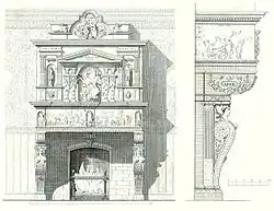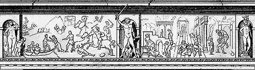 Ein Architrav stützt sich auf die beiden Füße. Das Thema ist der Brand von Troja. Drei Figuren in Hochrelief gliedern ein Flachrelief. In der Mitte Jupiter mit Schwert und Blitzen zwischen seinen Füßen der Adler, rechts Merkur, links Venus. Das Flachrelief zeigt auf der linken Seite die Darstellung einer eroberten Stadt, die Bewohner flüchten in Kähnen, sie werden verfolgt von den Siegern auf Rossen. Im Hintergrund im Flachrelief Reiter über eine Brücke herziehend. Auf der rechten Seite wird der Brand Trojas dargestellt, im Vordergrund sind zusammenstürzende und flüchtende Frauen dargestellt, rechts Gruppen aus dem Raffaelschen Brand des Borgo. An den Schmalseiten rechts Pyramus und Thisbe am Brunnen, links Urteil des Paris.[1]