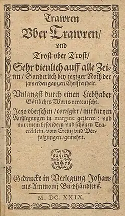 - ↑ Johann Amos Comenius: Ausgewählte Werke Bd.II,1. Hrsg.: Dmitrij Tschižewskij und Klaus Schaller. Georg Olms, Hildesheim New York 1976. Enthält Trauern über Trauern, Trost über Trost, die Ausgabe Bratislava 1629 auf den Seiten 143 – 208.