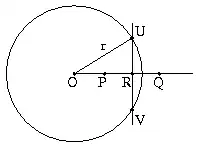 Der Punkt R liegt, anders als in der Skizze, außerhalb des Kreises, weswegen es den Schnittpunkt U nicht gibt. Denn aus Gleichung 5.) r² = OR² - PR² folgt OR² = r² + PR² > r². Der entscheidende Fehler wird also im vierten Schritt gemacht, wo ein Schnittpunkt U unterstellt wird, den es nicht geben kann.