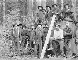 Gruppe von Holzfällern mit Trummsäge zur Bedienung von zwei Personen