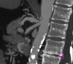 • Diagnostik: früher erfolgte zur Sicherung der Diagnose eine Angiographie, welche heute durch eine CT-Angiographie oder MRT-Angiographie ersetzt wurde, wobei die CT-Untersuchung wegen der besseren Darstellung der benachbarten Bauchorgane bevorzugt wird.[4]