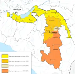 - ↑ Siehe Nummer 3 auf dieser Karte von Zuzijew (nicht die auf der anderen Seite des Westkaukasus anschließende Nummer 5, der Armenische Nationale Rayon).