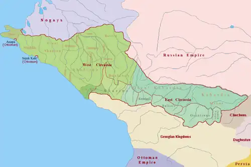 Für die Tscherkessen begannen die Kriege bereits, als sich Mitte des 18. Jahrhunderts eine Fraktion der nomadischen Nogaier vor den von Russland angesiedelten Wehrbauern, den Kosaken, in die Region südlich des Kuban zurückzog und dabei den Tscherkessenstamm der Adamijer besiegte. Die Kuban-Nogaier waren später an den Kämpfen um die Unabhängigkeit auf tscherkessischer Seite beteiligt. Bald darauf eroberten die Kubankosaken die Taman-Halbinsel vom Stamm der Schanejer. Die beiden Kabarda-Fürstentümer wurden 1825 annektiert. Während es hier in den Jahren um 1774 sehr heftige Widerstände der pro-krimtatarischen Partei der Kabardiner gegen Russland und die pro-russische Partei gab, war nach der Annexion der Widerstand hier nur noch gering.[112] Im 19. Jahrhundert kämpften vor allem die westlichen Tscherkessenstämme, die entweder von führenden Fürsten oder gewählten Kriegsführern befehligt wurden, noch um ihre Unabhängigkeit.