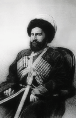 Ab ca. 1827/29 vereinigten sich viele nordostkaukasische Völker (Tschetschenen und Dagestaner) unter Ghazi Muhammad, danach Hamsat Bek und schließlich Imam Schamil zum islamischen Aufstand gegen die Expansion Russlands und erschwerten so dem Russischen Kaiserreich die Eroberung. Schamil wurde 1859 von den russischen Truppen gefangen genommen, was den tschetschenisch-dagestanischen Widerstand brach. Im Nordwestkaukasus spielte dieser sogenannte Muridenkrieg aber nur zeitweilig eine Rolle. Er wurde von Schamils Statthalter für den Westkaukasus Muḥammad al-Amīn befehligt. Ihm gelang es 1848–1851, die meisten Bjedughen, Schapsugen, und kleinere Teile der Natchuajer und Ubychen und die Mehrheit der turksprachigen Karatschaier und Balkaren hinter sich zu bringen. Sein Rivale war der vom Osmanischen Reich unterstützte Ṣaffār-bey (Sefer-bey San(uqo)/Seferbiy Saneqo), der ab 1845 die meisten Natchuajer und Abadsechen hinter sich hatte. Beide zeitweilig bedeutenden überregionalen Befehlshaber gerieten aber in den 1850er Jahren in die Defensive und wurden 1859 besiegt, wobei sich Muḥammad al-Amīn ergab und Ṣaffār-bey umkam.[113] Die meiste Zeit des Krieges wurden die tscherkessischen Stämme von Kriegsführern angeführt, die von Schamil oder vom Osmanischen Reich unabhängig waren.