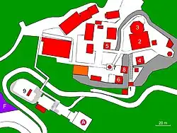 Man betritt die Tempelanlage am Fuße der Anhöhe durch das Tempeltor (山門 Sanmon; 1 im Plan) aus dem Jahr 1212, das hier als Niō-Tor (仁王門 Niō-mon), also durch ein Tor mit den beiden Tempelwächtern rechts und links von Durchgang, ausgeführt ist. Dann steigt man eine lange Treppe hoch zur inneren Anlage, die auf einem felsigen Plateau errichtet wurde. Dort steht eine Dreistöckige Pagode (三重塔 Sanjū-no-tō; 4) und die „Anbetungshalle“ (礼堂 Reidō; 2), an der sich die Haupthalle (八角堂 Hakkaku-dō; 3), hier achteckig ausgeführt, anschließt. Die Anbetungshalle und die Pagode sind als Wichtiges Kulturgut Japans registriert.
