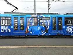 Der Sportverein ist mit einem eigenen U-Bahn-Design im örtlichen Nahverkehr der VGF unterwegs.[18] Die „Makkabi-Bahn“ ist in den vereinstypischen Farben blau-weiß gehalten. Neben dem großen Vereinslogo sind auch der Vereinsname sowie der vereinstypische Spruch „Makkabi Chai“ zu sehen. Anlass der „Makkabi-Bahn“ war das 50-jährige Jubiläum des Sportvereins im Jahre 2015.[19] Seit dem Jahr 2024 fährt die Makkabi-Bahn in einem neuen Design.