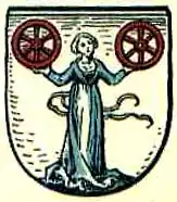 Blasonierung: „In Silber eine blaugekleidete Jungfrau, in jeder Hand ein rotes Rad emporhaltend.“[12]