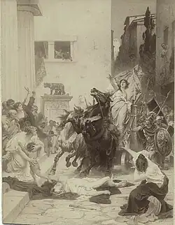Nach dem doppelten Gattenmord heiratete Tullia ihren Schwager und veranlasste ihn zum Staatsstreich, damit sie selbst die Herrschaft übernehmen konnten. Tarquinius Superbus schritt rasch zur Tat und stieß Servius Tullius nach einem Streit die Treppen der Kurie herab. Auf Tullias Betreiben schickte Tarquinius Superbus Schergen aus, die den flüchtigen, alten König unterhalb des Esquilin an der Kreuzung des vicus Cyprius und clivus Urbius[4] einholten und töteten. Als sich Tullia, die mit ihrer Kutsche zum Forum geeilt war, um Tarquinius Superbus als Erste als neuen König zu begrüßen, wieder auf den Heimweg machte, sah der Lenker ihres Wagens unterwegs den Leichnam ihres Vaters liegen. Da er daraufhin zögerte weiterzufahren, überfuhr Tullia mit dem Gespann selbst ihren toten Vater. So traf sie blutbespritzt zu Hause ein. Deshalb wurde die Stelle, an der sich diese Untat ereignet hatte, vicus sceleratus (= „Verbrechensgasse“) genannt.[5]