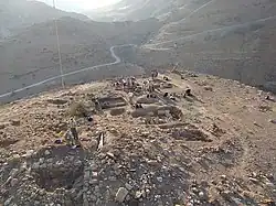 Auf den beiden obersten Terrassen des Hügels sind bislang drei Siedlungsphasen archäologisch nachgewiesen. (I) Die älteste Besiedlung stammt aus der Zeit zwischen 1300 und 970 v. Chr. (nach 14C-Daten); bislang sind keine zugehörigen Baureste nachgewiesen, aber Schichten und Funde. Zumindest ein Vorgänger der Befestigungsmauer, die Terrasse I und II umschließt, gehört ebenfalls in diese Zeit. Die in der jüngeren Architektur (II-III) als Baumaterial verbauten Steine mit Ritzzeichnungen könnten von einem Kult- oder Repräsentationsbau dieser ältesten Phase oder etwas später aus der Zeit 900 – 700 v. Chr. stammen. Die drei bislang gefundenen größeren und deutbaren Fragmente zeigen (a) den Kopf eines geschmückten Löwen, (b) eine Frau oder ein Kind mit einer Ziege, und (c) eine mit (a-b) stilistisch verwandte Darstellung zweier (sitzender?) bartloser Personen, die jeweils ein deutlich ihre Köpfe überragendes Instrument vor sich halten, möglicherweise eine Harfe. Überdies stammen von der obersten Terrasse Holzkohlen, die auf 1960–1750 v. Chr. 14C-datiert wurden; diese stehen derzeit jedoch isoliert da, ihre Deutung ist unklar. - (II) In bislang nur kleinen Ausschnitten sind auf der obersten Terrasse Fundamente von Bauten nachgewiesen, die in der Zeit 375 – 175 v. Chr. errichtet und beim Bau der jüngsten Phase niedergelegt wurden. - (III) Auf dem obersten Plateau stand zuletzt eine palastartige Anlage von etwa 30 × 30 m Größe mit zwei nach Osten vorgelagerten, aneinandergrenzenden Peristylhöfen von je ca. 15 × 15 m Größe. Die Architekturfragmente dieses Palasts werden stilistisch späthellenistisch bzw. in die frühen Jahre von Herodes I. (73 – 4 v. Chr.) datiert, Münzen und 14C-Daten erhärten diesen Zeitansatz. Detailbefunde lassen vermuten, dass diese Architektur z. T. zweigeschossig war und neben Stein auch Lehmziegel als Baumaterial verwendet wurden. Dieser Palast endete mit einem Brandereignis vermutlich nach ca. 50 – 25 v. Chr., danach wurde die Anlage geräumt und nicht wieder genutzt. Später ist das noch aufrecht Stehende bei einem Erdbeben zusammengestürzt.