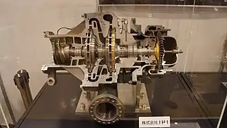 Beispiele für das Hauptstromverfahren sind das Aerojet Rocketdyne RS-25 (Space Shuttle Main Engine) und das BE-4 sowie die russischen RD-0120- und RD-170-Triebwerke.[23] Die Turbopumpeneinheit des RD-170 wird von einem Gemisch aus der gesamten Menge des Sauerstoffs und einem geringen Anteil Kerosin angetrieben (engl. oxydizer rich staged combustion cycle). Sie besteht aus einer einstufigen axialen Strahlturbine für den Antrieb, einer einstufigen Kreiselpumpe für die Förderung des Sauerstoffs und einer zweistufigen Kreiselpumpe für das Kerosin.[13]