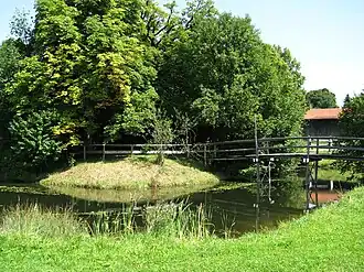 ![]() Turmhügel Hechenberg – Blick über den wassergefüllten Graben | ||