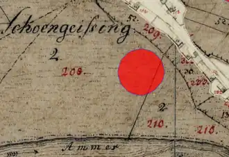 ![]() Lageplan von Turmhügelburg Schöngeising auf dem Urkataster von Bayern | ||