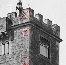 Gegen den dokumentierten Widerstand der Wartburgverwaltung wurden mit Unterstützung des damaligen Eisenacher NSDAP-Kreisleiters am Sonntag, den 10. April 1938 (Tag der Reichstagswahl und Volksabstimmung 1938) Gerüstteile auf den Turm getragen und zeitgleich in der Bevölkerung das Gerücht verbreitet, dass die Standsicherheit des Kreuzes durch Fäulnis im hölzernen Unterbau des Kreuzes überprüft werden müsse. Mit dieser List sollte ein harmloser Vorwand für die bereits geplante Demontage des Kreuzes am Folgetag gefunden werden. Auf Veranlassung des thüringischen Gauleiters Fritz Sauckel sollte die Wartburg mit einem bereits vorbereiteten Hakenkreuz auf dem Turm versehen werden, das mittels elektrischer Beleuchtung auch in den Nachtstunden sichtbar sein sollte.[3] Das Vorhaben gelang zunächst und wurde auch am 11. April mit einem vom Eisenacher Gauleiter angeführten Marsch der Eisenacher Hitlerjungen und ihren BDM-Kameradinnen zelebriert.